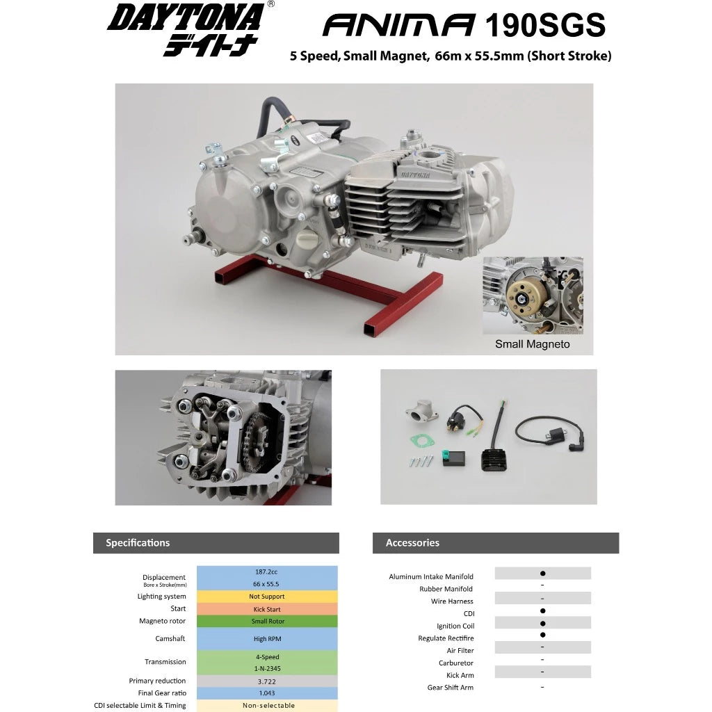 Mesin Motor Daytona Anima 190SGS untuk penggunaan Racing. Mesin ini sudah banyak digunakan di dunia untuk penggunaan MiniGP, Flat Track, Minimoto hingga Gokart.